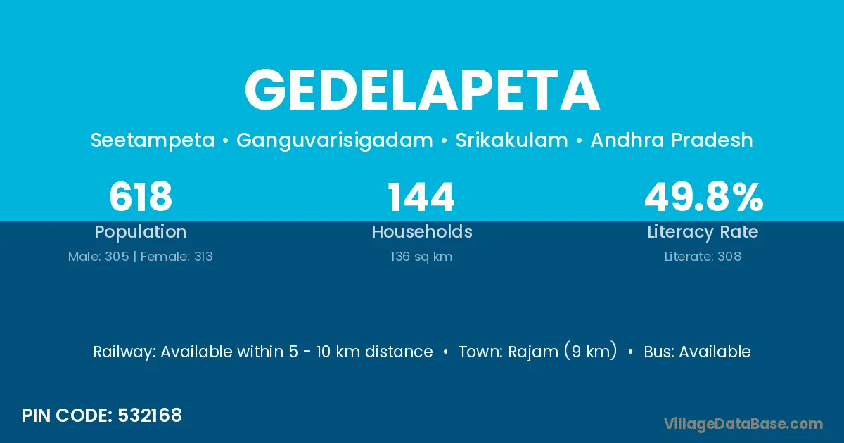 Gedelapeta village has a total population of 618 people, of which 305 are males and 313 are females.