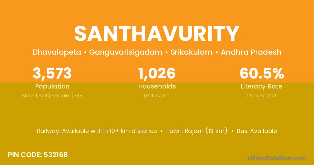 Rajam (13 km) is the nearest town to Santhavurity village for major economic activities and is located approximately 13 km away.