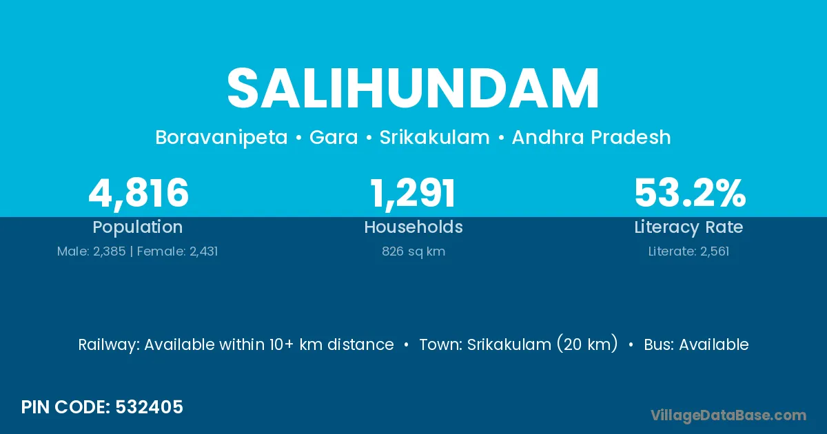 Salihundam village has a total population of 4,816 people, of which 2,385 are males and 2,431 are females.