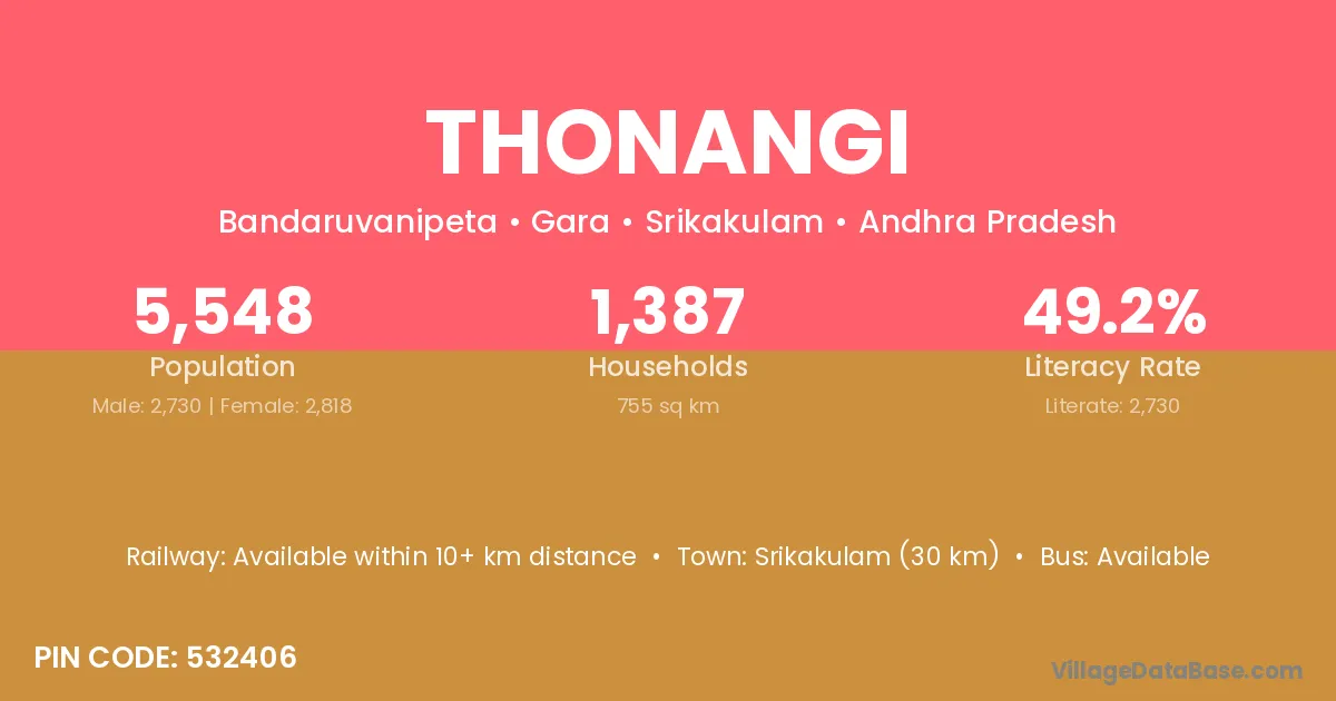 Srikakulam (30 km) is the nearest town to Thonangi village for major economic activities and is located approximately 30 km away.