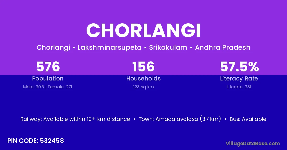 Srikakulam (12 km) is the nearest town to Chorlangi village for major economic activities and is located approximately 12 km away.