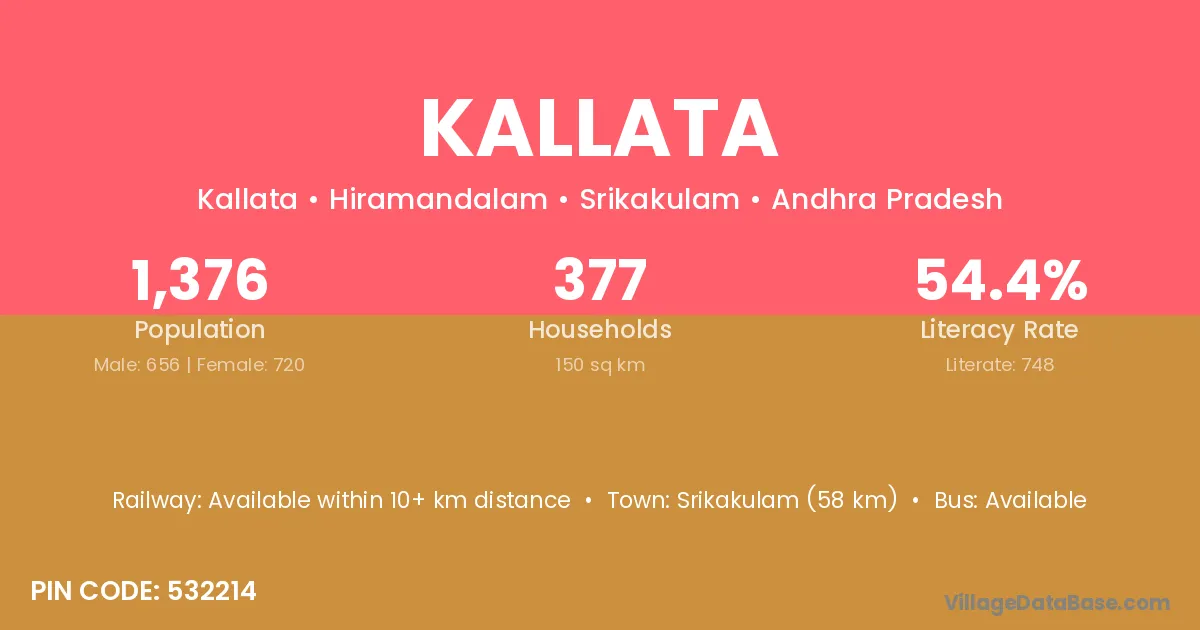 Srikakulam (58 km) is the nearest town to Kallata village for major economic activities and is located approximately 58 km away.