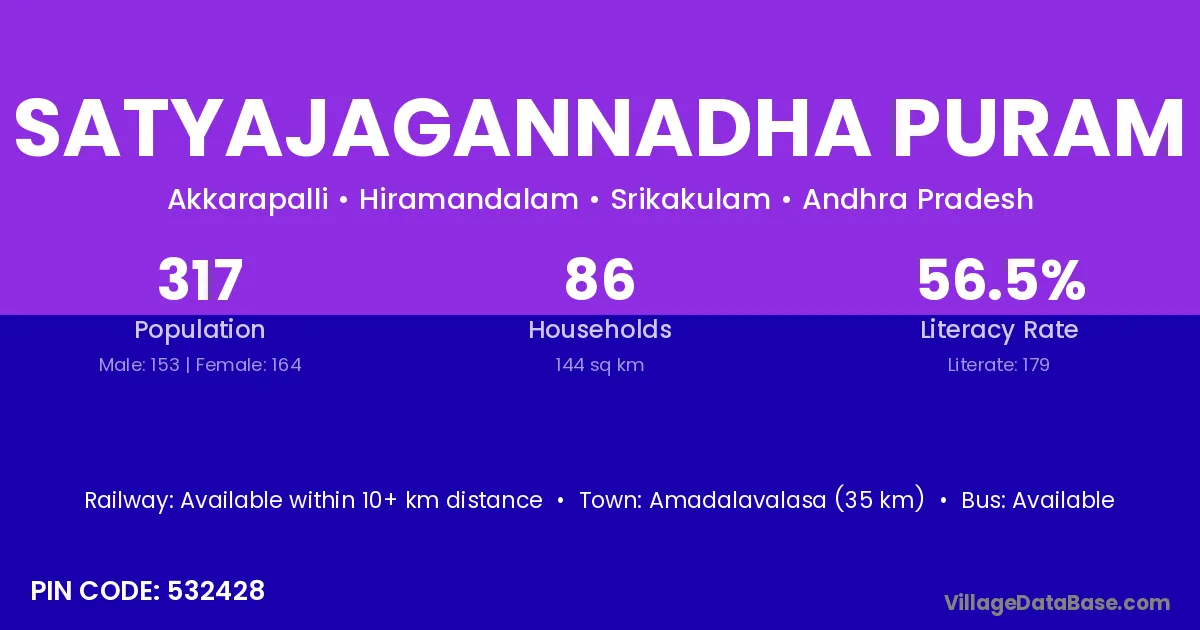 Satyajagannadha Puram village has a total population of 317 people, of which 153 are males and 164 are females.