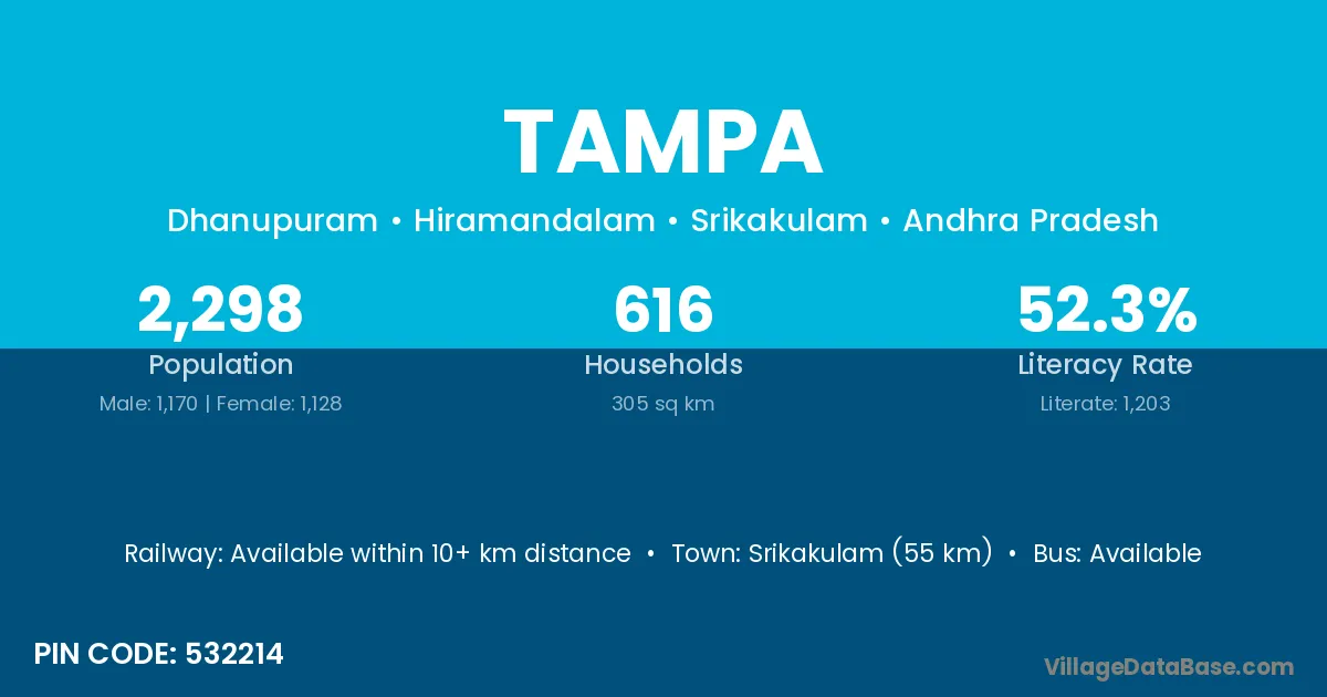 Srikakulam (55 km) is the nearest town to Tampa village for major economic activities and is located approximately 55 km away.