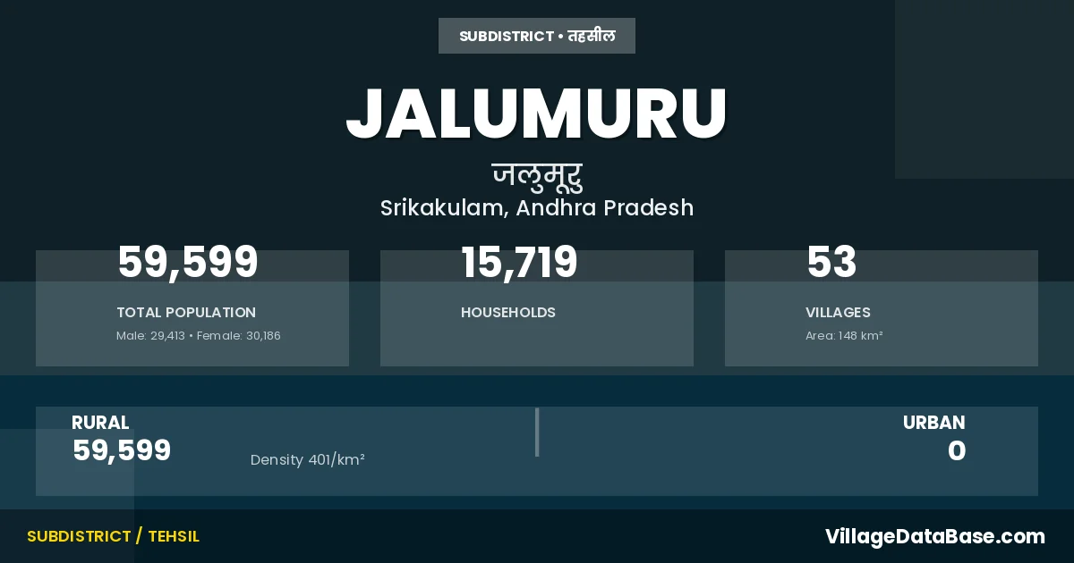 According to the 2011 census The total area of Jalumuru Mandal is 148 km², with a population of 59599 people. The population density is 401 inhabitants per square kilometre, and there are approximately 15719 houses in the sub district.