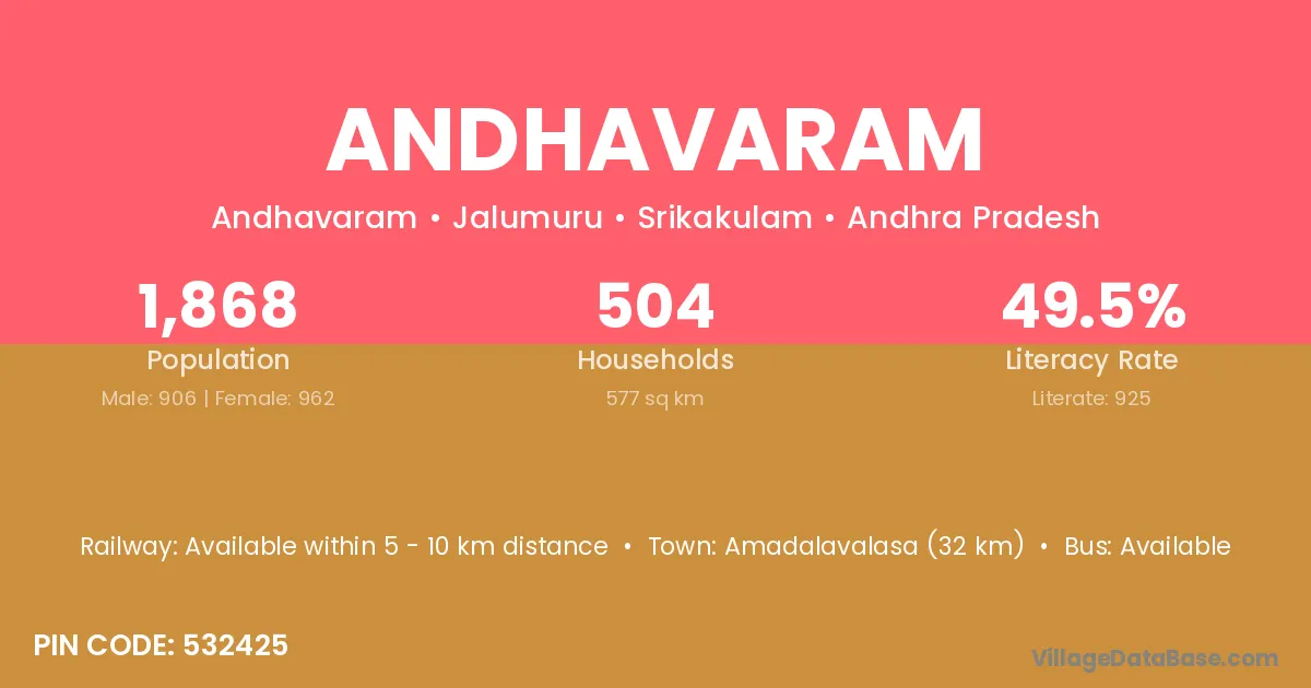 Amadalavalasa (32 km) is the nearest town to Andhavaram village for major economic activities and is located approximately 32 km away.