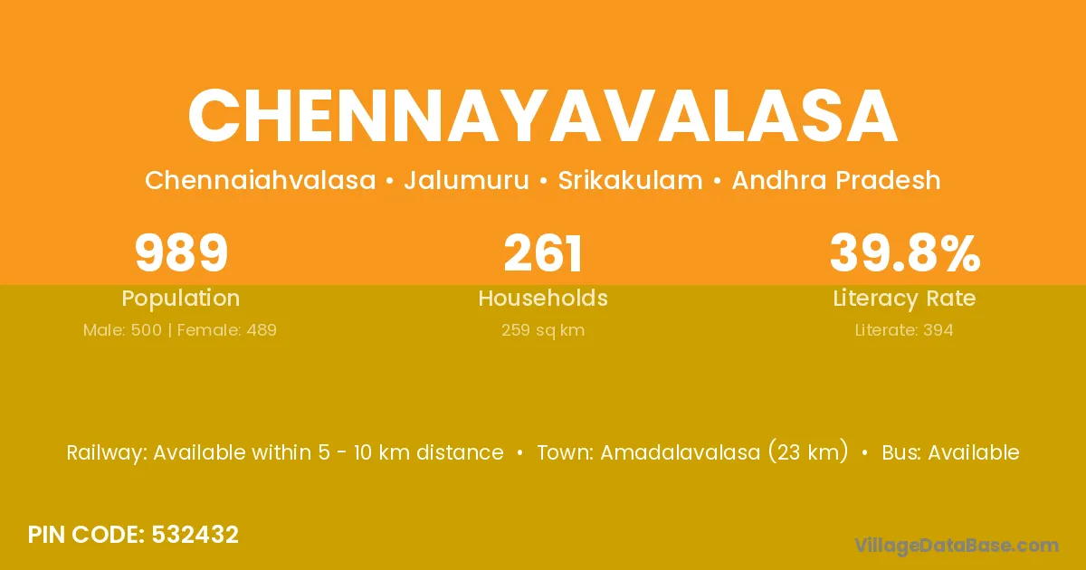 Chennayavalasa village has a total population of 989 people, of which 500 are males and 489 are females.