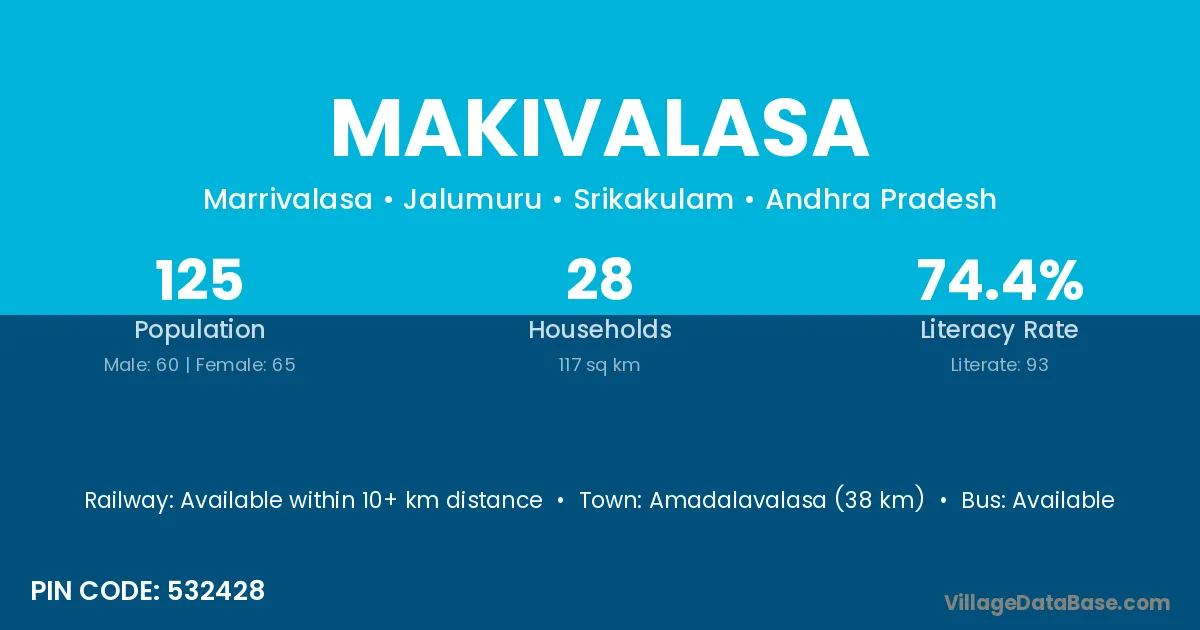 Amadalavalasa (38 km) is the nearest town to Makivalasa village for major economic activities and is located approximately 38 km away.