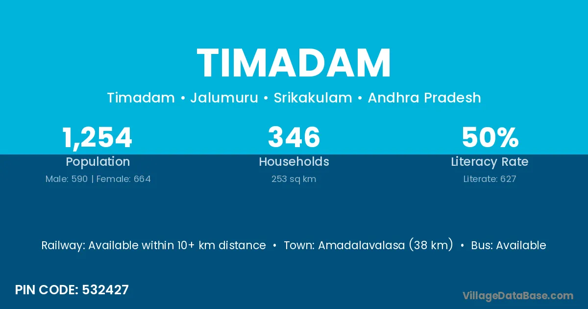 Amadalavalasa (38 km) is the nearest town to Timadam village for major economic activities and is located approximately 38 km away.