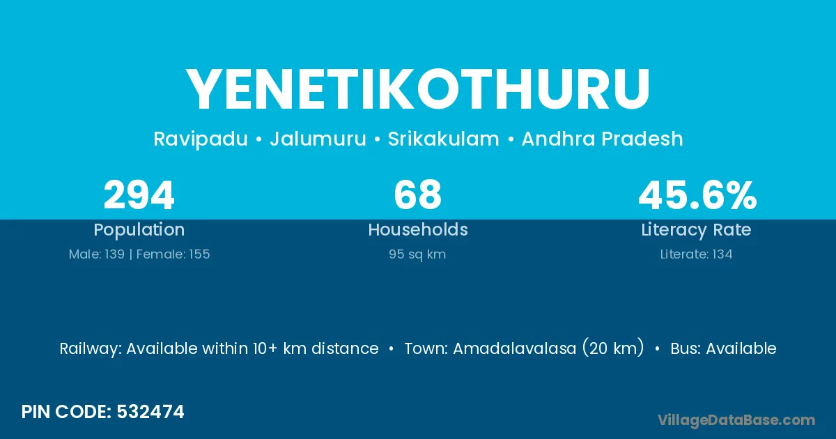 Yenetikothuru village has a total population of 294 people, of which 139 are males and 155 are females.