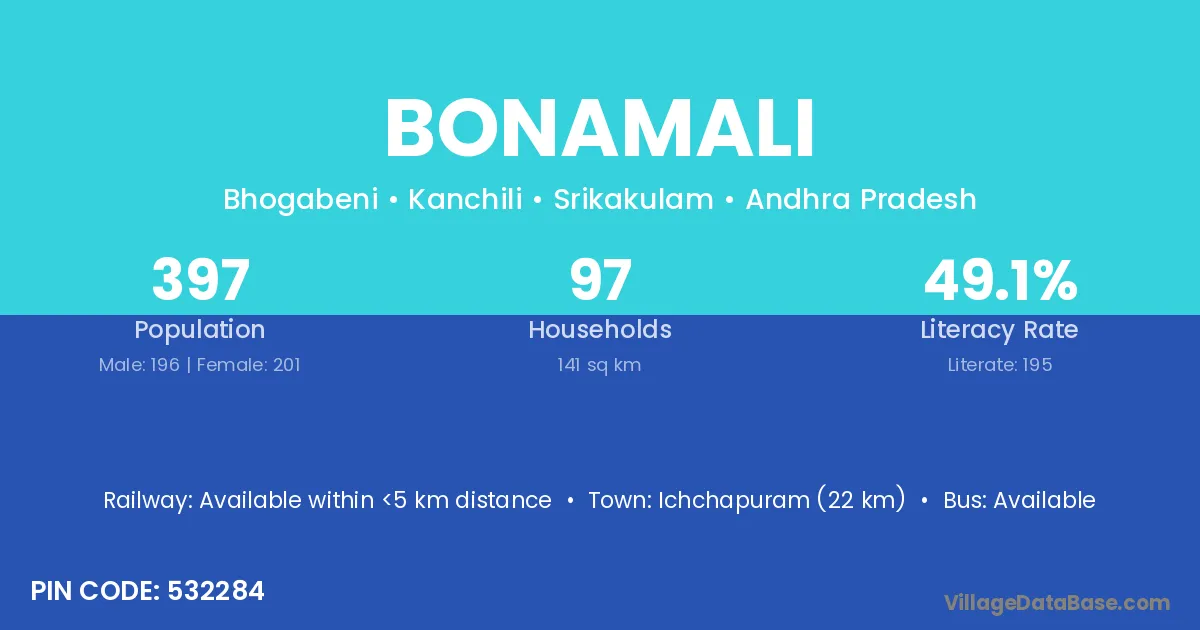 Ichchapuram (22 km) is the nearest town to Bonamali village for major economic activities and is located approximately 22 km away.
