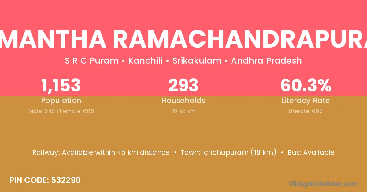 Ichchapuram (18 km) is the nearest town to Samantha Ramachandrapuram village for major economic activities and is located approximately 18 km away.