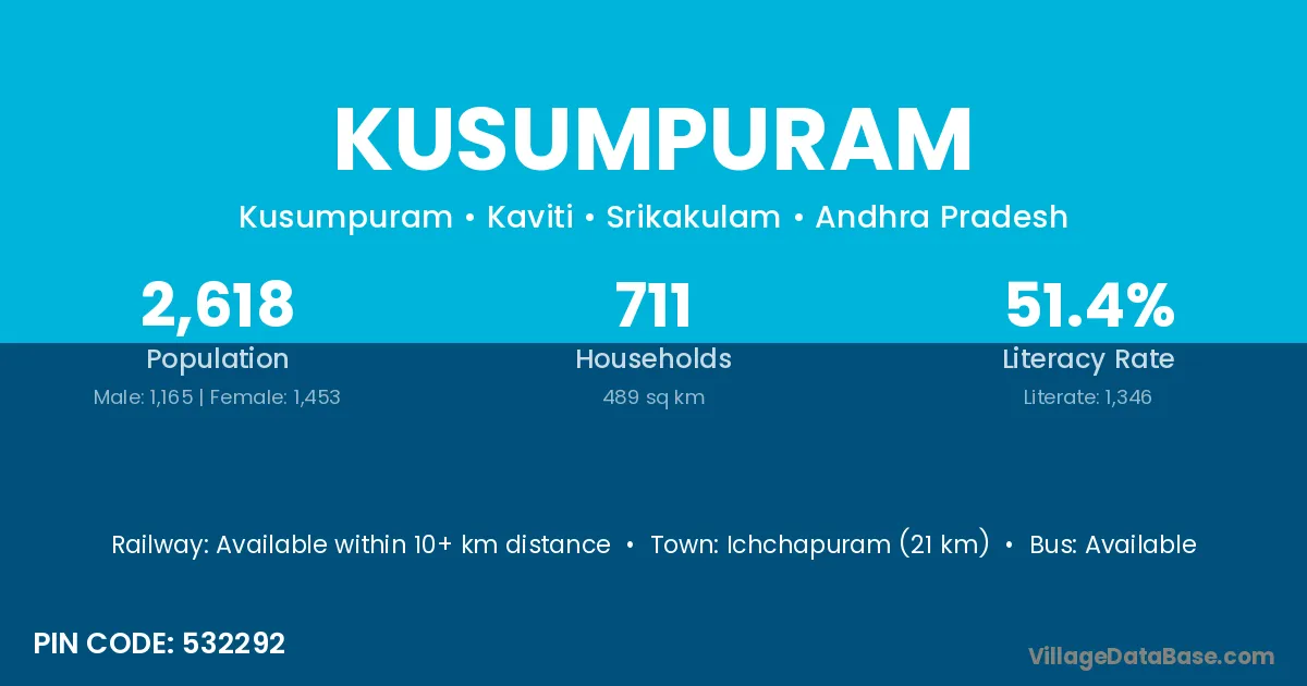 Ichchapuram (21 km) is the nearest town to Kusumpuram village for major economic activities and is located approximately 21 km away.