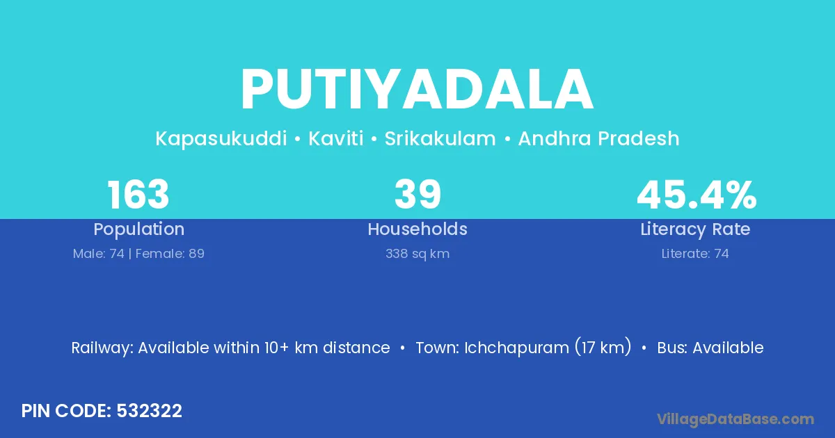 Ichchapuram (17 km) is the nearest town to Putiyadala village for major economic activities and is located approximately 17 km away.