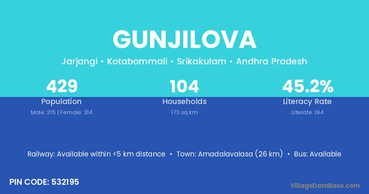 Amadalavalasa (26 km) is the nearest town to Gunjilova village for major economic activities and is located approximately 26 km away.