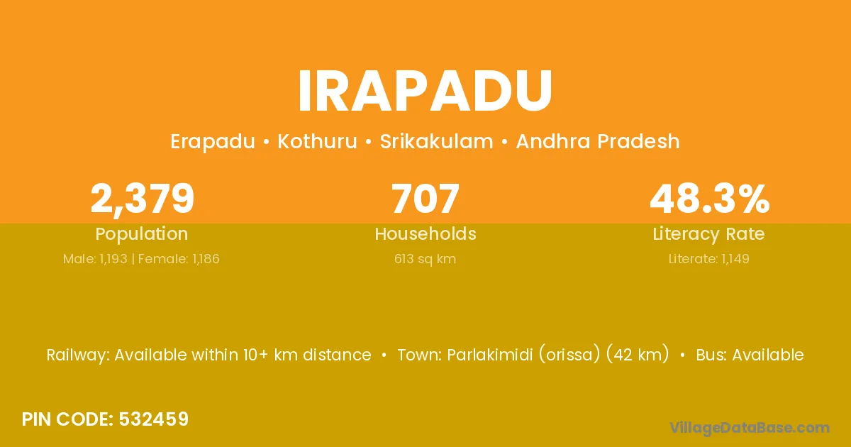 Parlakimidi (orissa) (42 km) is the nearest town to Irapadu village for major economic activities and is located approximately 42 km away.