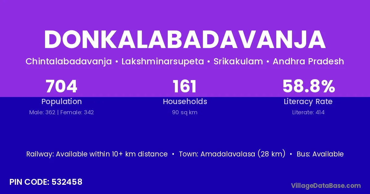 Amadalavalasa (28 km) is the nearest town to Donkalabadavanja village for major economic activities and is located approximately 28 km away.