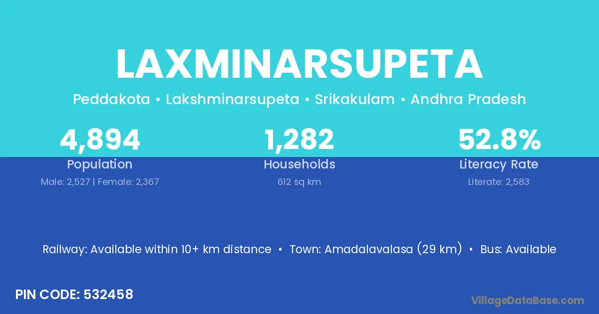 Amadalavalasa (29 km) is the nearest town to Laxminarsupeta village for major economic activities and is located approximately 29 km away.