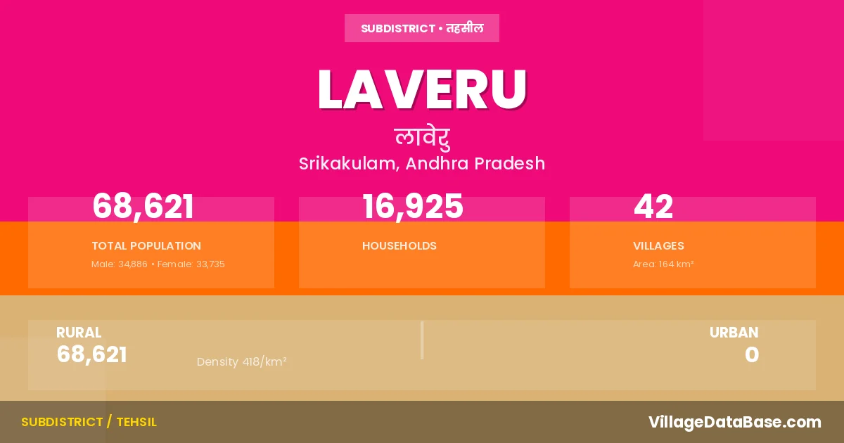 According to the 2011 census The total area of Laveru Mandal is 164 km², with a population of 68621 people. The population density is 418 inhabitants per square kilometre, and there are approximately 16925 houses in the sub district.