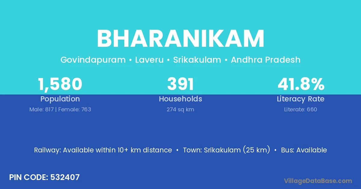 Bharanikam village has a total population of 1,580 people, of which 817 are males and 763 are females.