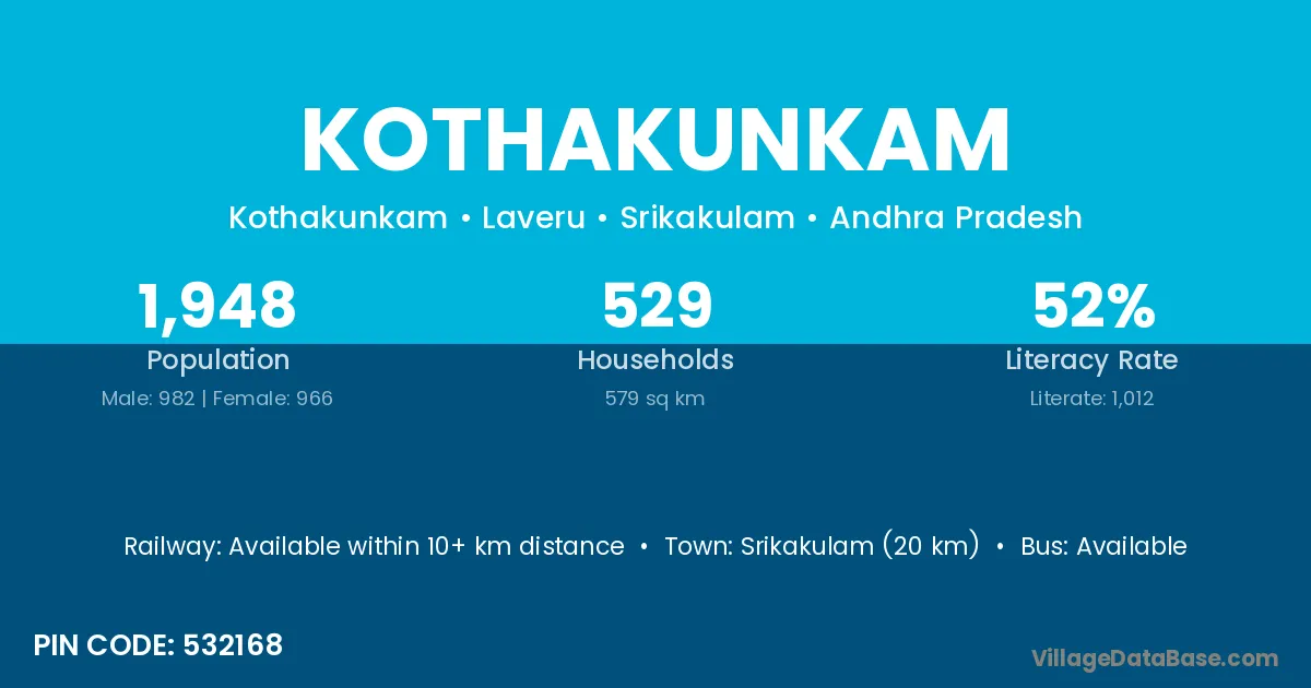 Srikakulam (20 km) is the nearest town to Kothakunkam village for major economic activities and is located approximately 20 km away.