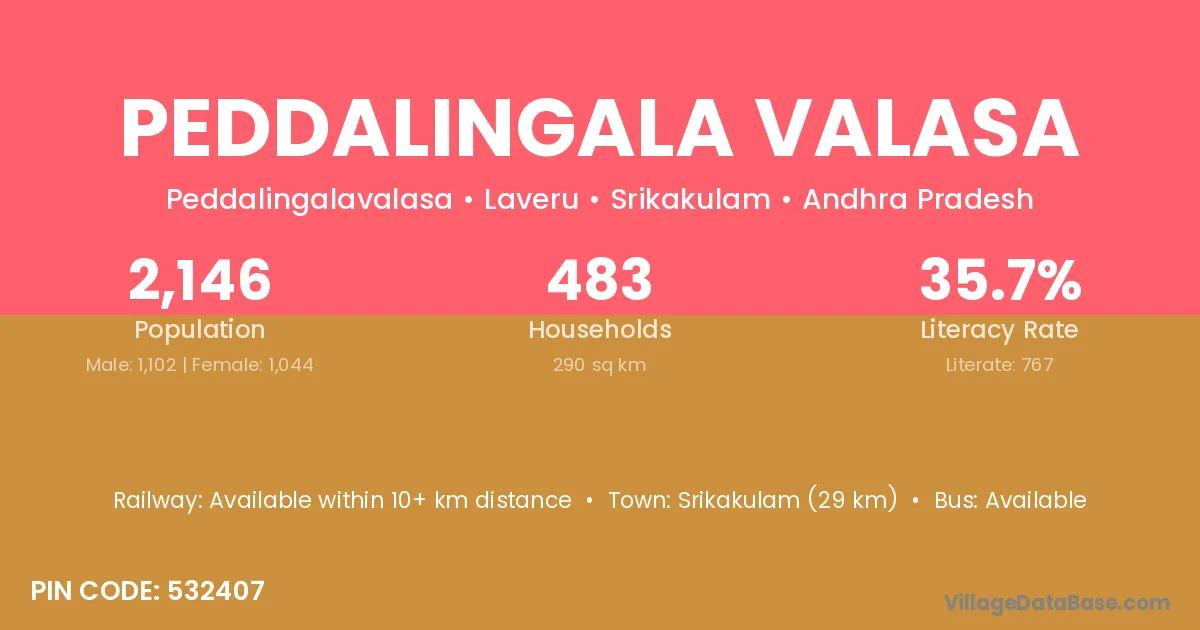 Peddalingala Valasa village has a total population of 2,146 people, of which 1,102 are males and 1,044 are females.