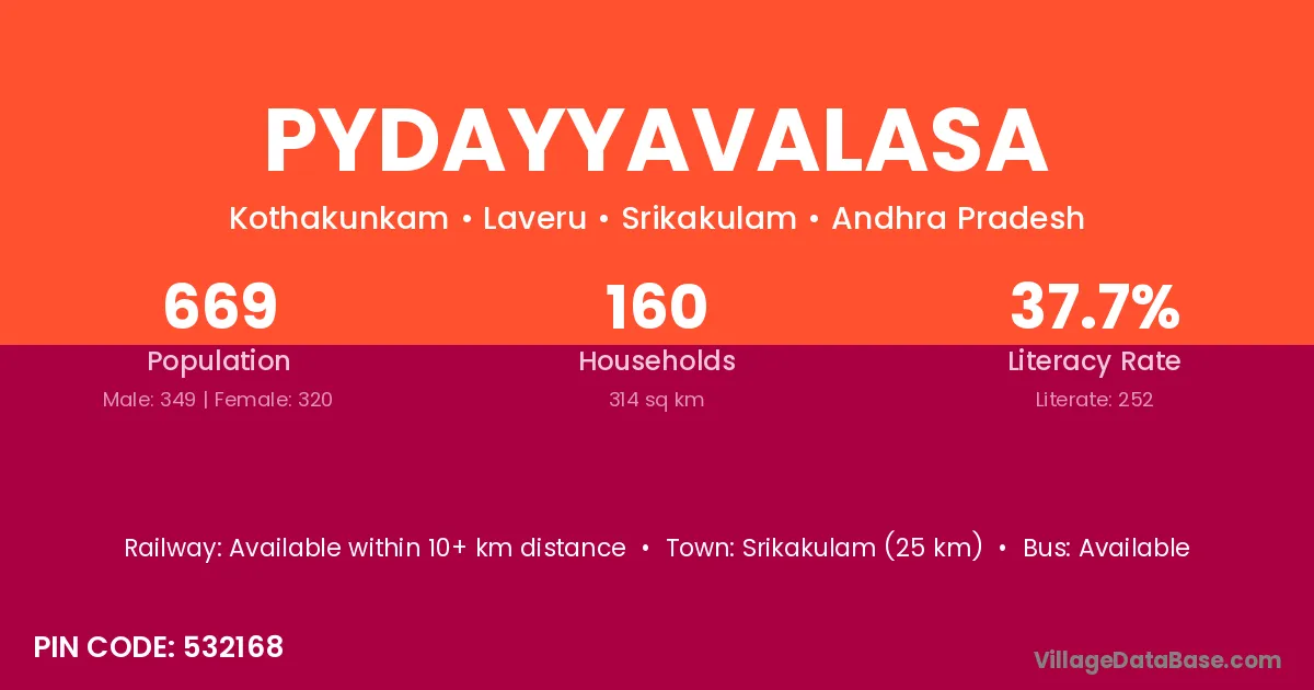 Pydayyavalasa village has a total population of 669 people, of which 349 are males and 320 are females.