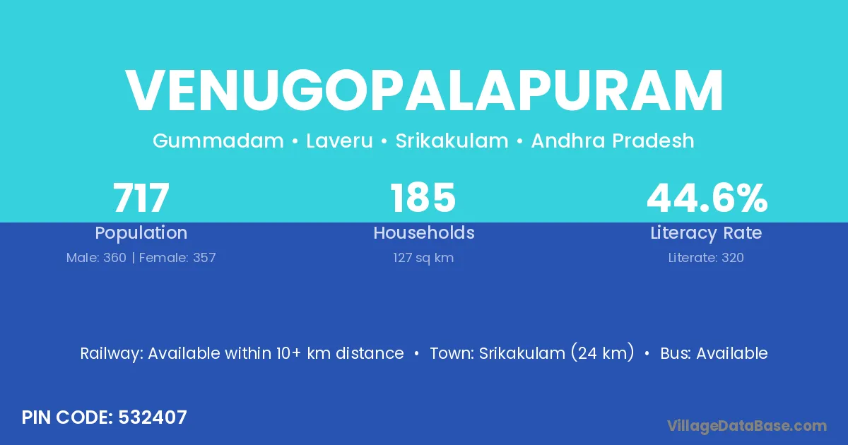 Venugopalapuram village has a total population of 717 people, of which 360 are males and 357 are females.