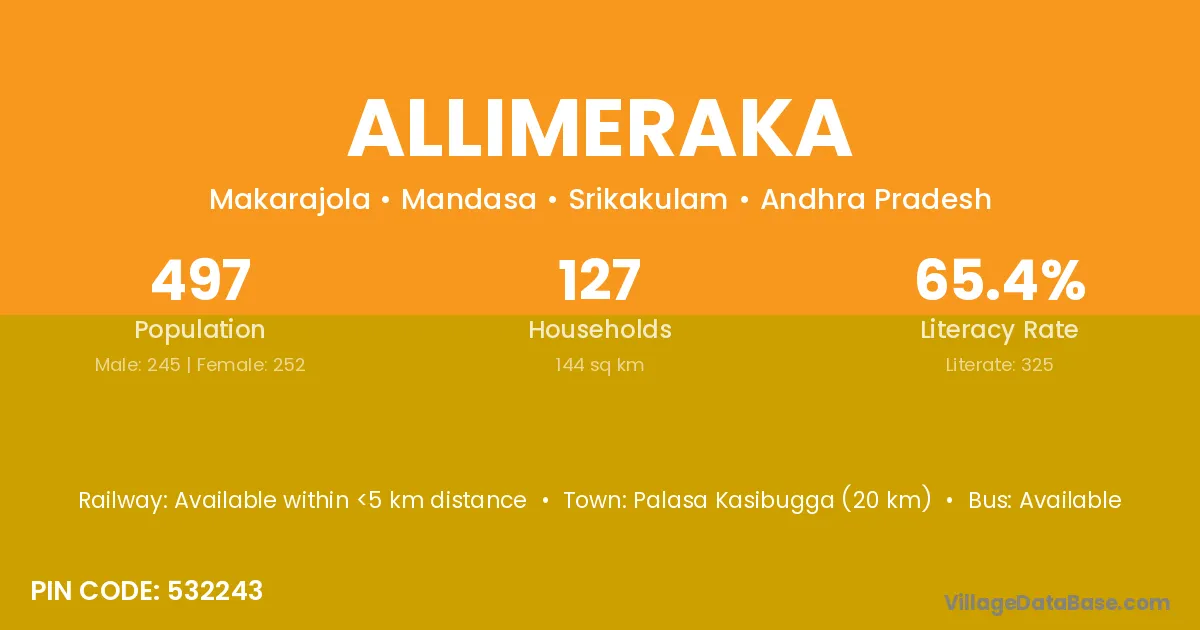 Palasa Kasibugga (20 km) is the nearest town to Allimeraka village for major economic activities and is located approximately 20 km away.