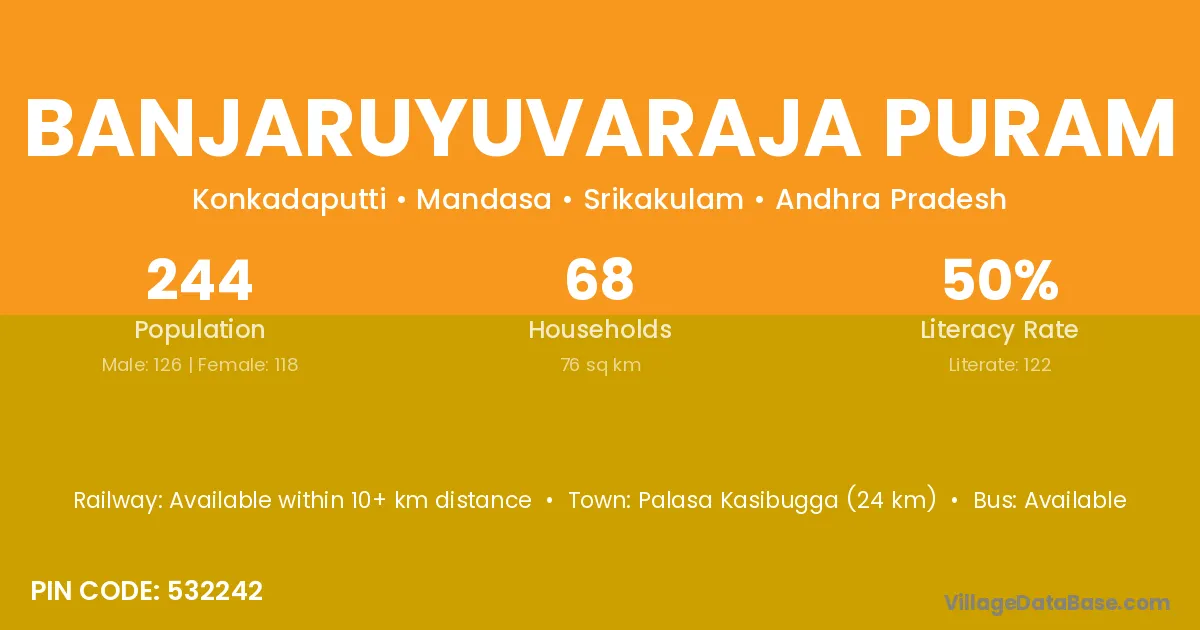 Palasa Kasibugga (24 km) is the nearest town to Banjaruyuvaraja Puram village for major economic activities and is located approximately 24 km away.