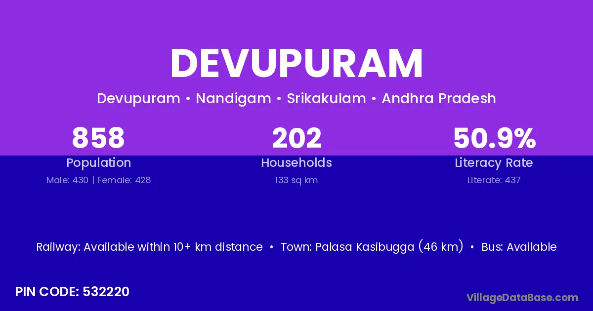 Palasa Kasibugga (20 km) is the nearest town to Devupuram village for major economic activities and is located approximately 20 km away.