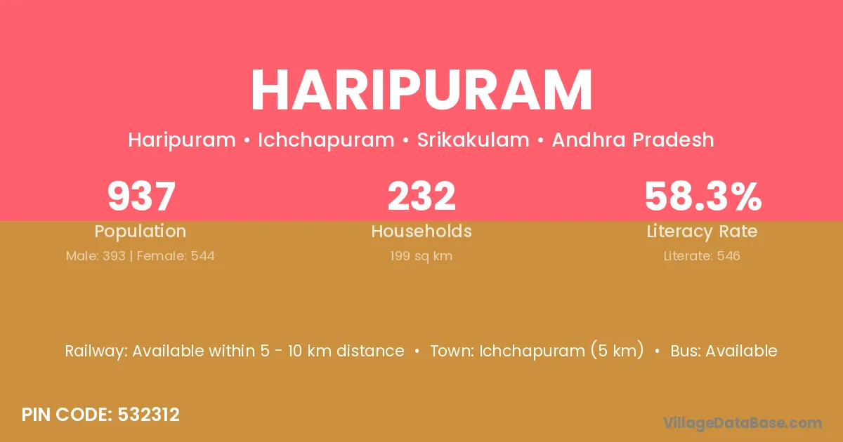 Palasa Kasibugga (21 km) is the nearest town to Haripuram village for major economic activities and is located approximately 21 km away.
