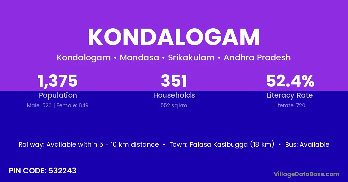 Palasa Kasibugga (18 km) is the nearest town to Kondalogam village for major economic activities and is located approximately 18 km away.