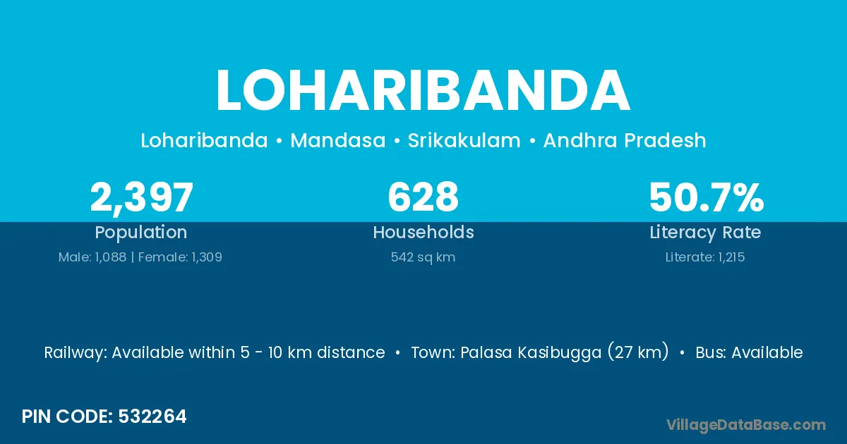 Palasa Kasibugga (27 km) is the nearest town to Loharibanda village for major economic activities and is located approximately 27 km away.