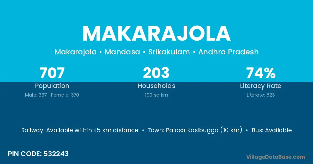 Palasa Kasibugga (10 km) is the nearest town to Makarajola village for major economic activities and is located approximately 10 km away.
