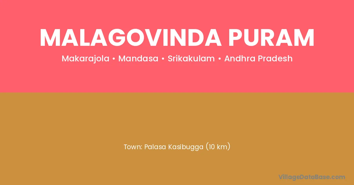 Palasa Kasibugga (10 km) is the nearest town to Malagovinda Puram village for major economic activities and is located approximately 10 km away.