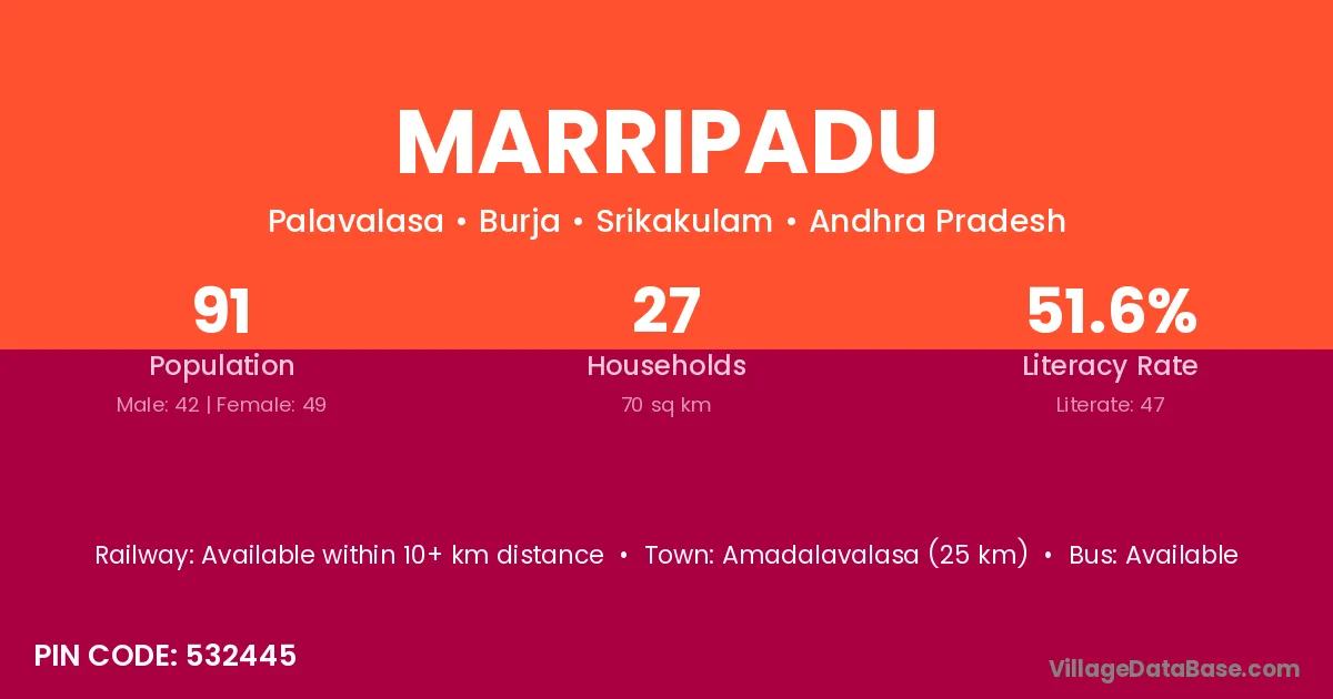 Palasa Kasibugga (30 km) is the nearest town to Marripadu village for major economic activities and is located approximately 30 km away.