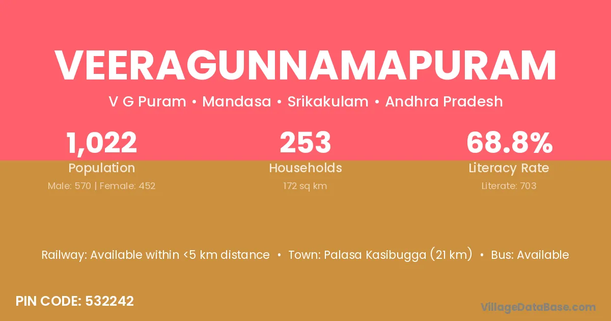 Palasa Kasibugga (21 km) is the nearest town to Veeragunnamapuram village for major economic activities and is located approximately 21 km away.