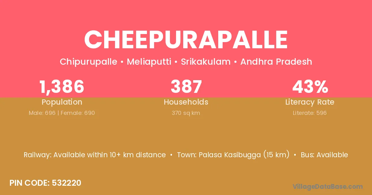 Cheepurapalle village has a total population of 1,386 people, of which 696 are males and 690 are females.