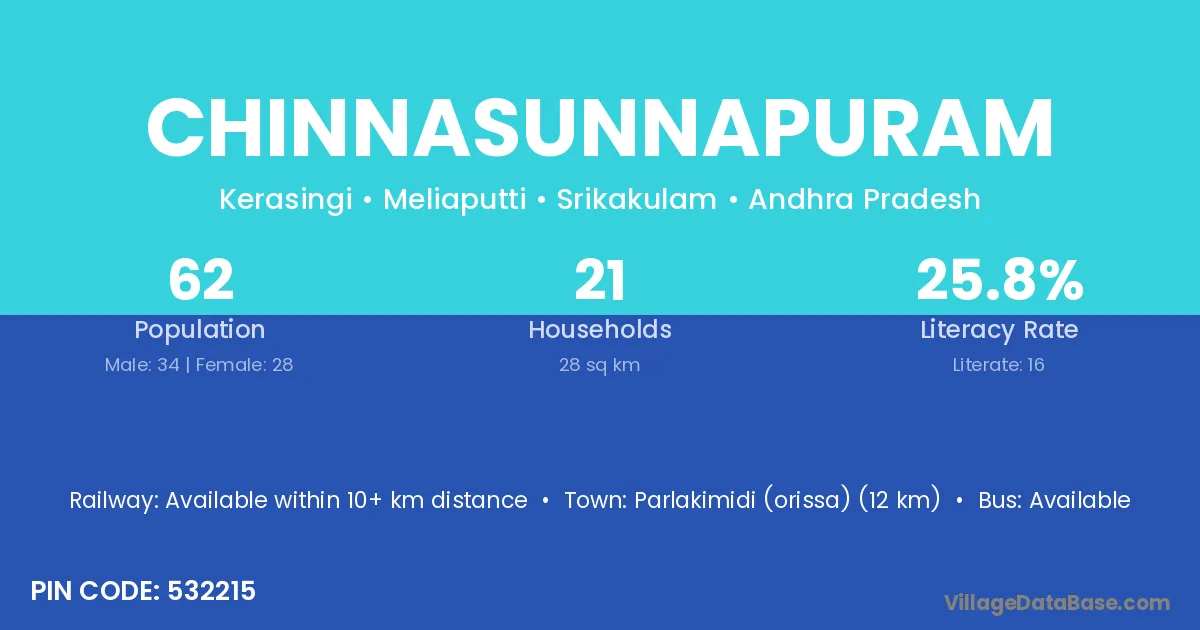 Parlakimidi (orissa) (12 km) is the nearest town to Chinnasunnapuram village for major economic activities and is located approximately 12 km away.