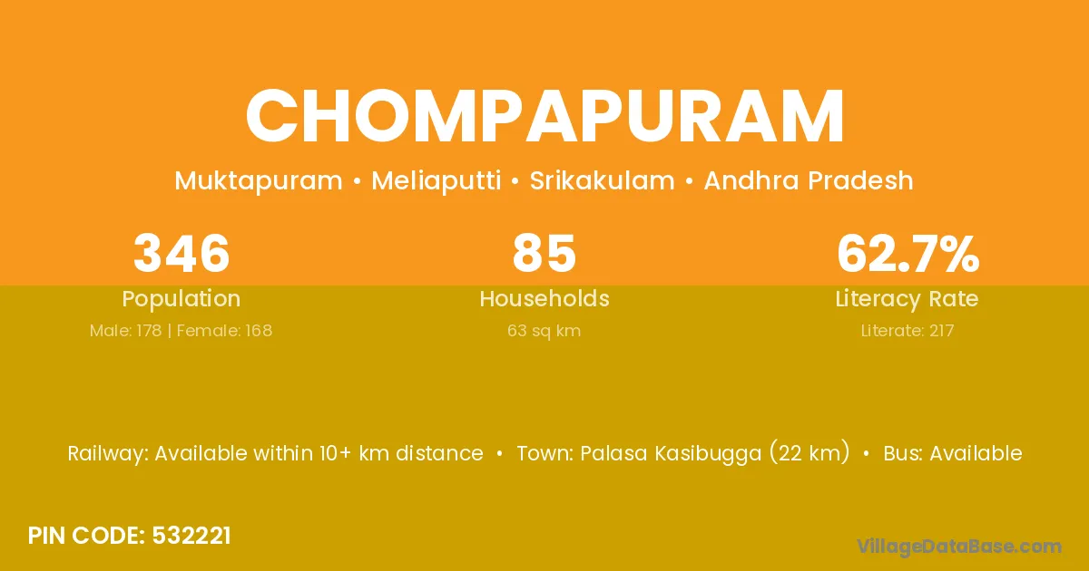 Palasa Kasibugga (22 km) is the nearest town to Chompapuram village for major economic activities and is located approximately 22 km away.