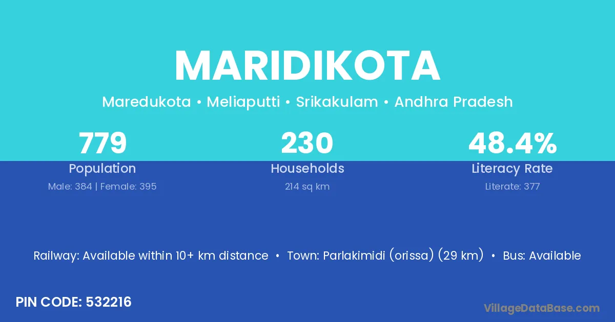 Parlakimidi (orissa) (29 km) is the nearest town to Maridikota village for major economic activities and is located approximately 29 km away.