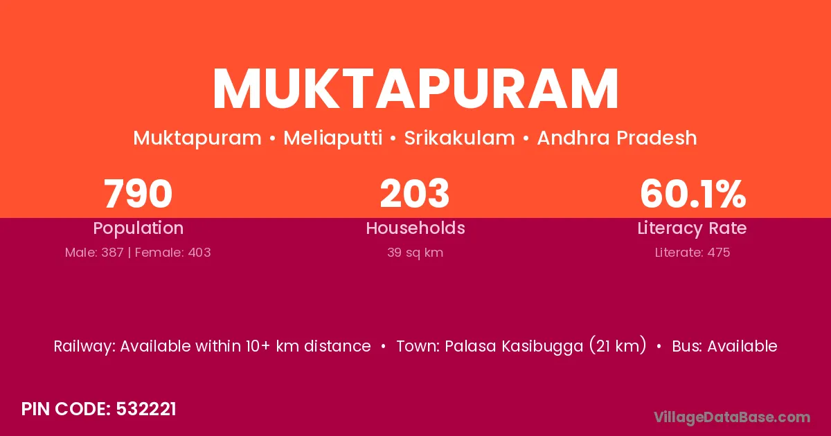 Palasa Kasibugga (21 km) is the nearest town to Muktapuram village for major economic activities and is located approximately 21 km away.