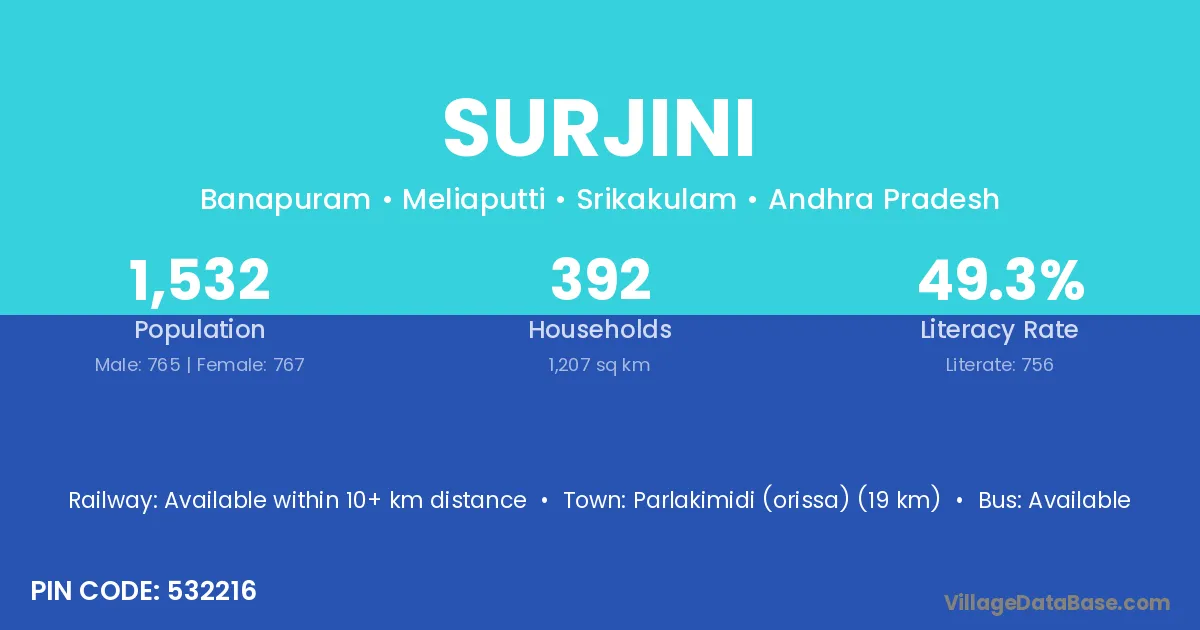 According to Census 2011 information, the village code of Surjini village is 532216.