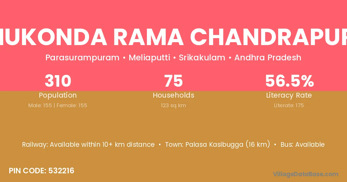 Palasa Kasibugga (16 km) is the nearest town to Tumukonda Rama Chandrapuram village for major economic activities and is located approximately 16 km away.