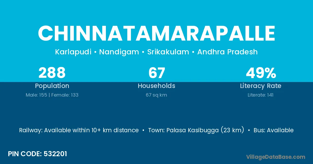 Palasa Kasibugga (23 km) is the nearest town to Chinnatamarapalle village for major economic activities and is located approximately 23 km away.