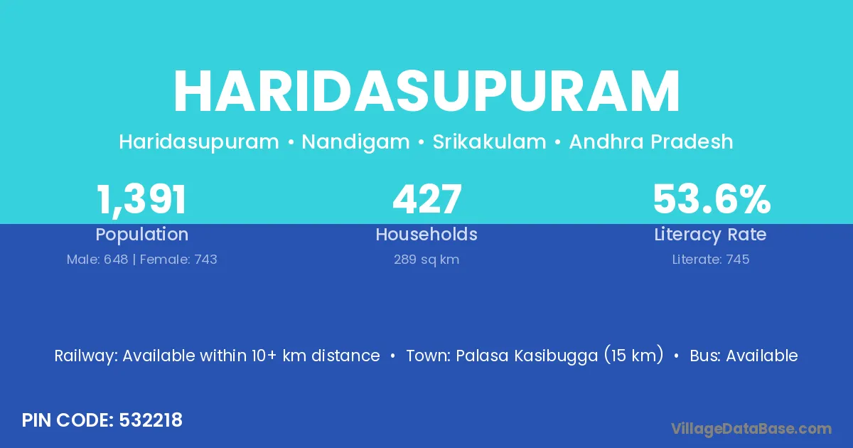 Palasa Kasibugga (15 km) is the nearest town to Haridasupuram village for major economic activities and is located approximately 15 km away.