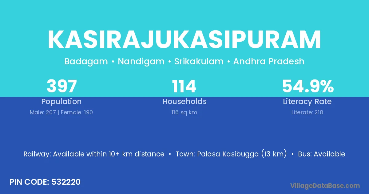 Palasa Kasibugga (13 km) is the nearest town to Kasirajukasipuram village for major economic activities and is located approximately 13 km away.