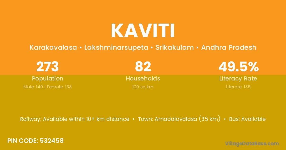 Palasa Kasibugga (9 km) is the nearest town to Kaviti village for major economic activities and is located approximately 9 km away.