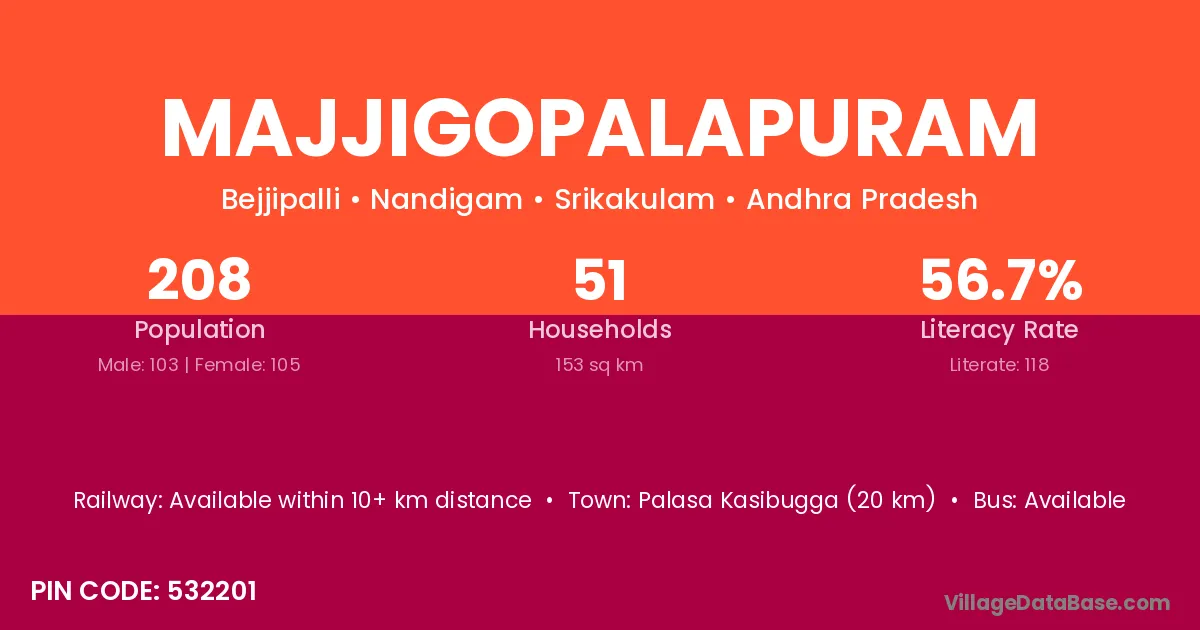 Majjigopalapuram village has a total population of 208 people, of which 103 are males and 105 are females.